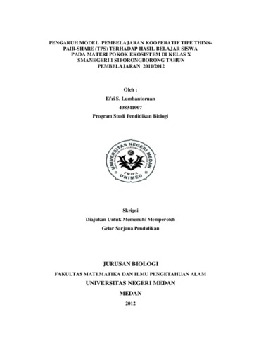 Penelitian ini bertujuan untuk mengetahui pengaruh model pembelajaran kooperatif tipe Think-Pair-Share (TPS) terhadap hasil belajar siswa pada materi pokok ekosistem di kelas X SMA Negeri 1 Siborongborong Tahun Pembelajaran 2011/2012. Populasi dalam penelitian ini adalah seluruh siswa kelas X yang terbagi atas 10 kelas dengan jumlah siswa sebanyak 392 orang dan sampel penelitian dua kelas yaitu kelas X2 yang diambil secara acak menggunakan pembelajaran kooperatif tipe TPS dengan jumlah siswa sebanyak 40 orang dan kelas X1 menggunakan model pembelajaran konvensional dengan jumlah siswa sebanyak 40 orang. Jenis penelitian ini adalah penelitian eksperimen. Adanya pengaruh model pembelajaran Think-Pair-Share (TPS) dalam meningkatkan penguasaan materi biologi diketahui dari kemampuan siswa dalam mengerjakan soal biologi sebelum dan sesudah proses belajar mengajar. Hasil penelitian menunjukkan bahwa pengajaran dengan menggunakan model Think-Pair-Share (TPS) dapat meningkatkan penguasaan siswa terhadap materi biologi karena metode ini menekankan siswa untuk lebih aktif memperhatikan pelajaran karena mereka terlibat secara aktif. Hasil pengujian hipotesis dengan menggunakan uji-t dan taraf kepercayaan  = 0,05, dimana thitung > ttabel (6,50 > 1,67), yang berarti dalam penelitian ini Ho ditolak sekaligus menerima Ha. Sehingga dapat disimpulkan bahwa ada pengaruh model pembelajaran kooperatif tipe Think-Pair-Share (TPS) terhadap hasil belajar siswa pada materi pokok ekosistem di kelas X SMA Negeri 1 Siborongborong Tahun Pembelajaran 2011/2012.