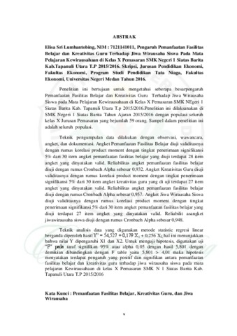Lumbantobing, Elisa Sri (2016) PENGARUH PEMANFAATAN FASILITAS BELAJAR DAN KREATIVITAS GURU TERHADAP JIWA WIRAUSAHA SISWA PADA MATA PELAJARAN KEWIRAUSAHAAN DI KELAS X PEMASARAN SMK NEGERI 1 SIATAS BARITA KAB.TAPANULI UTARA T.P 2015/2016. Undergraduate thesis, UNIMED.