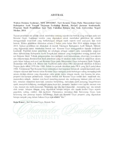 Syahzuar, Wahyu Desiana (2014) TARI KESUME GAYO PADA MASYARAKAT GAYO KABUPATEN ACEH TENGAH TINJAUAN TERHADAP BENTUK. Undergraduate thesis, UNIMED.