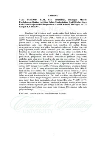 Sari, Yuni Purnama (2017) PENERAPAN METODE PEMBELAJARAN OUTDOOR ACTIVITIES DALAM MENINGKATKAN HASIL BELAJAR SISWA PADA MATA PELAJARAN ILMU PENGETAHUAN ALAM (IPA) DI KELAS IV SD NEGERI 101775 SAMPALI T.A 2016/2017. Undergraduate thesis, UNIMED.