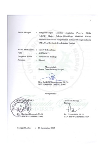 SIHOMBING, SARI Y (2017) PENGEMBANGAN LEMBAR KEGIATAN PESERTA DIDIK (LKPD) MATERI POKOK KLASIFIKASI MAKHLUK HIDUP SESUAI KEBUTUHAN PENGALAMAN BELAJAR BIOLOGI KELAS X SMA/MA BERBASIS PENDEKATAN ILMIAH. Undergraduate thesis, UNIMED.