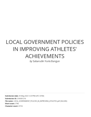 Br Meliala, Ekarina Kamanita and Bangun, Sabaruddin Yunis and Hariadi (2021) LOCAL GOVERNMENT POLICIES IN IMPROVING ATHLETES' ACHIEVEMENTS. Indonesia Sport Journal, 4 (1). pp. 1-9. ISSN P-ISSN: 2655-7525, E-ISSN: 2655-7770