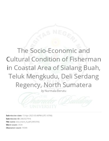 Wirda, Mona Adria and Berutu, Nurmala and Rahmad, Riki (2017) The Socio-Economic and Cultural Condition of Fisherman in Coastal Area of Sialang Buah, Teluk Mengkudu, Deli Serdang Regency, North Sumatera. Sumatra Journal Of Disaster, Geography And Geography Education (SJDGGE), 1 (2). pp. 124-129. ISSN 2580-4030; 2580-1775