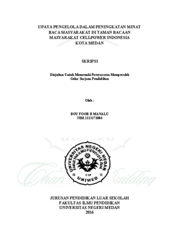 Manalu, Boy Foor B (2016) UPAYA PENGELOLA DALAM PENINGKATAN MINAT BACA MASYARAKAT DI TAMAN BACAAN MASYARAKAT CELLPOWER INDONESIA KOTA MEDAN. Undergraduate thesis, UNIMED.